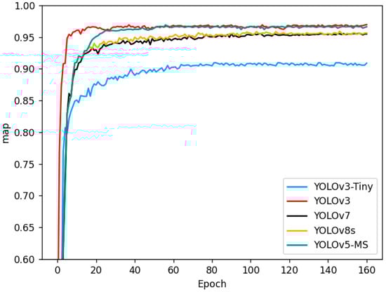 To further ascertain the model’s performance, the YOLOv5-MS model was subjected to a comparison with YOLOv3-Tiny, YOLOv3, YOLO7, and YOLOv8s. The models were evaluated using consistent hyperparameters and training parameters. This study aims to identify a pedestrian target detection algorithm suitable for extensive camera usage in smart cities, striking a balance between accuracy and speed. The mAP trends of the five models over the initial 170 epochs are illustrated in Figure 11. All the models were simultaneously evaluated for their inference time on the platform designed as described above, while the ultimate outcomes are presented in Table 4. The results indicate that YOLOv5-MS exhibits a commendable mAP and inference speed performance.