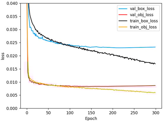 Figure 12 displays the training progress of the YOLOv5-MS model over 300 epochs, illustrating both a training loss curve and a validation loss curve. The horizontal axis represents the epoch, while the vertical axis represents the corresponding loss value. It is noticeable that the loss function of the training set steadily decreases over the epochs. However, the confidence loss of the validation set begins to exhibit a gradual increase after approximately 160 epochs. Moreover, the loss related to border regression starts to stabilize, suggesting a potential tendency towards overfitting in the model. Consequently, training could be halted around the 160th epoch.