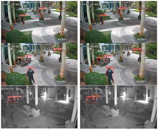 Fueled by technological advancements and a growing emphasis on security awareness, video surveillance has garnered extensive adoption across smart cities [,]. Nevertheless, the abundance of surveillance images demands increased labor costs, a process that consumes time and fails to ensure the precision of pedestrian identification. The integration of intelligent target detection models rooted in deep learning into smart city contexts holds promise for enhancing urban security systems [], thereby reducing the property damage and casualties caused by criminals with a lower cost and higher efficiency. This model can be applied to 24 h pedestrian target detection in smart cities thanks to the creation of a comprehensive dataset that enhances its adaptability to various scenarios. This model also exhibits distinctive characteristics in nighttime recognition. By implementing this approach, it becomes possible to alert security personnel only when a relevant target is detected, thereby greatly improving their efficiency and ensuring the area’s security.