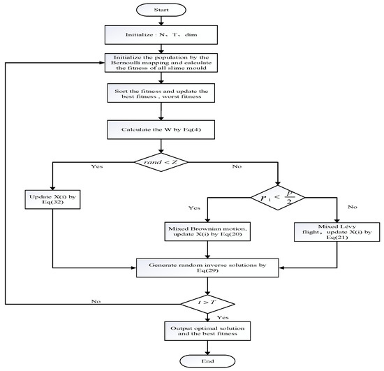 The optimization algorithm selected in this paper is the slime mould algorithm (SMA) proposed by Li et al. in 2020 [20]. The SMA is inspired by slime molds’ behavior and morphological changes during foraging. The SMA has been applied to various engineering optimization problems because of its simple code and few parameters. However, SMA needs to improve in dealing with complex and high-dimensional problems. Researchers have continuously optimized the SMA in recent years. There are generally two kinds of improved strategies: one is to improve the core equation of the algorithm by using a variety of strategies, and the other is to mix a variety of algorithms to improve efficiency. Yu et al. [21] combined reverse learning and chaotic mapping to optimize SMA and performed well in urban water resources treatment. Naik et al. [22] proposed to add adaptive reverse learning at the later stage of iteration to avoid the premature end of convergence. Zhang et al. [23] presented reverse learning and Quantum Rotation Gate strategies to the SMA. Jiang et al. [24] proposed an improved SMA based on elite reverse learning. The adaptive probability threshold was adopted to adjust the selection probability of slime moulds. The quality and diversity of the initial population are improved. Alfadhli et al. [25] chose to integrate adaptive parameters into the iteration of the population. The improved method adaptively changes the population size to effectively balance the characteristics of exploitation and exploration in different stages of the SMA. Liu et al. [26] introduced Chebyshev chaotic mapping in the initialization stage. They added the simplex method in the later exploration stage to increase local search ability and avoid premature convergence, which achieved excellent results in extracting PV model parameters. Qiu et al. [27] proposed a mechanism for updating locations in stages, which divided the iteration time into three segments on average. Different stages mix different optimization strategies to balance exploitation and exploration; researchers have also integrated other swarm intelligence algorithms with SMA [28,29,30,31,32], respectively, in either the exploration or exploitation stage to carry out different degrees of optimization, and achieved excellent results in image segmentation, support vector regression (SVR) prediction problems, and other directions.