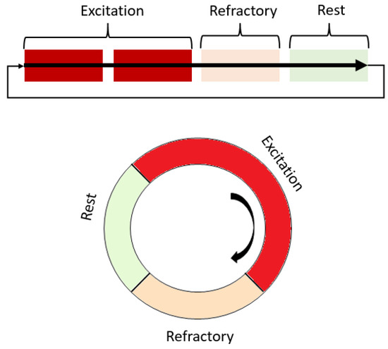 Scheme of the operation of the excitation and spiral wave according to the states that a single element of the excitable medium passes through. Red shades highlight areas that are non-excitable during work or partially excitable.