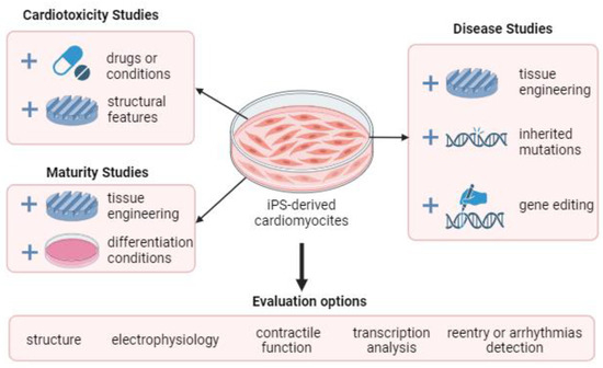 Induced pluripotent stem cells can be used for many tasks in modern cardiology: cardiotoxicity, patient-specific study of pathologies, and the study of the processes of cell differentiation and tissue maturation. The main functions of cardiomyocytes induced from pluripotent stem cells are presented in Figure 3. Typically, the evaluation of any biomimetic of cardiac tissue, depending on the purpose of its creation, is based on the following parameters, which evaluate the proximity to real tissue: the resulting structure, electrophysiology, tissue maturity, etc.