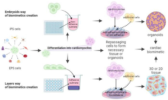 To better understand how models are designed for various purposes, we compiled Table 2, where biomimetics of cardiac culture are divided into three main subgroups: organoids, microtissues, and engineered models of cardiac tissue. All models were constructed using specific substrates and specific cells for different cardiac tissue model purposes. Having followed the available biomimetics, one can notice some patterns; 3D modeling often does not provide the structural features of the tissue and is based on the formation of embryoid bodies. Two-dimensional modeling, on the contrary, focuses on structural features, and it is possible to model specific pathologies using it (Table 2).