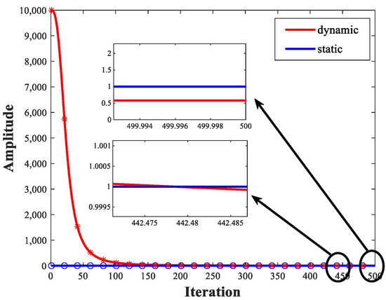 Lens imaging strategy is a form of opposition-based learning [44]. By refracting the object on one side of the convex lens from the convex lens to the other side of the convex lens, a more optimal solution can be obtained. However, in traditional convex lens imaging mechanisms, the imaging coefficients are often a fixed value, which is not conducive to generating population diversity. Therefore, this paper proposes a novel lens imaging strategy that expands the diversity of the population and increases the possibility of obtaining high-quality solutions by setting dynamically updated imaging coefficients. The dynamically updated imaging coefficient is defined here as , which can be calculated by Equations (9)–(11). Figure 1 shows the variations of the static lens imaging strategy and the emotional lens imaging strategy. The dynamic lens imaging strategy can search for more effective regions to improve the population’s diversity and enhance the algorithm’s global search ability.