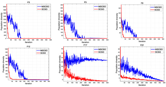 Population diversity is an important part of the qualitative analysis of algorithms. This article demonstrates the population changes of SCSO and MSCSO algorithms during optimization through population diversity experiments. Taking global optimization as an example, unimodal and multimodal functions were selected, with dimensions of 30 and fixed. The population diversity can be calculated by Equations (14) and (15) [47]. The population diversity curves of SCSO and MSCSO are shown in Figure 3.