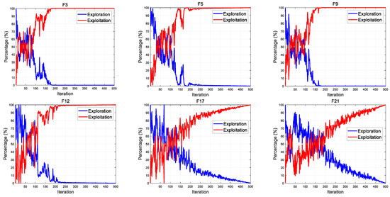 During the optimization process, different algorithms have different design ideas, resulting in differences in exploration and exploitation. Therefore, when designing a new algorithm, it is necessary to measure the exploration and exploitation of the algorithm in order to conduct a practical analysis of the search strategies that affect these two factors. The percentage of exploration and exploitation can be calculated by Equations (16)–(18) [47]. The exploration and exploitation of MSCSO is shown in Figure 4.
