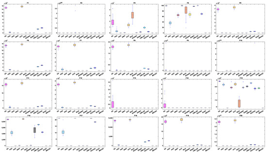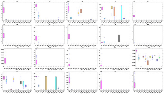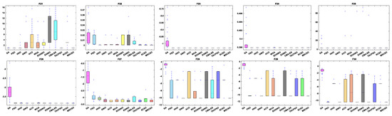 Time complexity is an essential indicator in algorithm comparison, representing the degree of time an algorithm takes to perform calculations, which is mainly reflected in the algorithm’s initialization, fitness evaluation, and update solution [46]. The computational complexity of SCSO is , where is the population size, is the computational dimension of the problem, and is the number of iterations. MSCSO has three more parts than SCSO. The time complexity of the new opposition-based learning strategy is , and the novel exploration mechanism replaces the original exploration mechanism; thus, there is no increase in time complexity. The time complexity of the elimination update mechanism is . Therefore, the time complexity of MSCSO is ; thus, the MSCSO proposed in this paper has equal time complexity compared to SCSO.