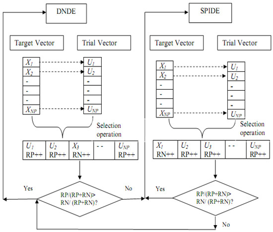 Now, the active variant is assigned a positive rank if the trial vector created by this technique is picked for the following generation; otherwise, a negative rank is assigned. At the conclusion of a generation, all positive and negative ranks for the active variant are added together. Let p1 and p2 represent the probabilities for DNDE and SPIDE, respectively, and let RP and RN represent the total positive and negative rankings in any generation. The probability is then updated based on the following rules: