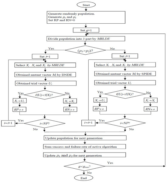 Proposed SaMDE is a fusion of MRLDE, DNDE and SPIDE. As recommended by the MRLDE method, the entire search space is initially partitioned into three sub-regions, and then the DNDE and SPIDE algorithms are utilized adaptively. The proposed rule updates the probability for mutation schemes based on their performance in any generation. Similar to a concept described by Qin et al. [41,42] in SaDE, where probability rules are updated based on the success and failure ratio of the variants, and then any variant is activated based on its probability. Instead of random activation, the variant with the highest likelihood or success rate will be activated in SaMDE.