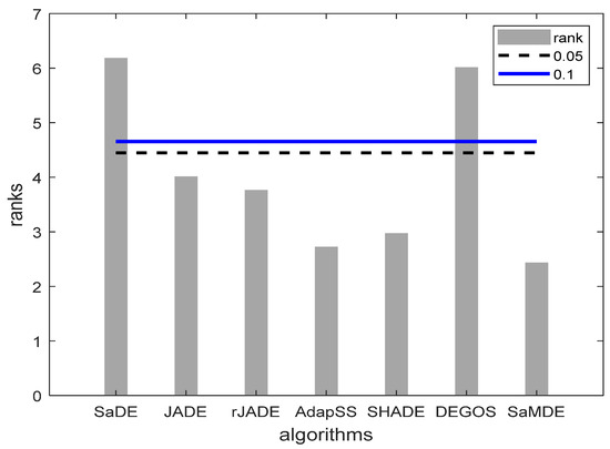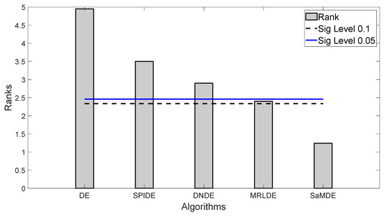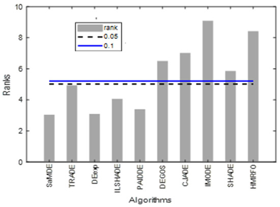 Bonferroni–Dunn bar charts on the results as given in Table 10. The Bar represents the algorithm’s rank and horizontal cut lines represent the significant levels.