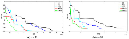 It can be seen that for n = 10, the fitness value obtained by SaMDE is −0.589389 which is best among those obtained by other algorithms. It can also be noticed that all algorithms perform similarly in terms of best fitness value. MRLDE gives the second-best performance for n = 10. Similarly, it can be seen that SaMDE gives the best results for n = 15, 20 and 25. MRLDE gives the second best performance while DERL and TDE take third and fourth place, respectively, for each n = 15, 20 and 25.