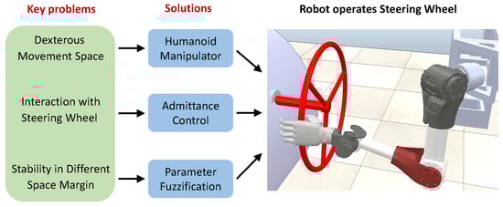 - Rojas, J.; Newman, W.; Jie, H.; Liu, Q. A steering wheel manipulation scheme by an anthropomorphic humanoid robot in a constrained vehicle environment. In Proceedings of the IEEE International Conference on Robotics and Biomimetics ROBIO, Zhuhai, China, 6–9 December 2015; pp. 1566–1571. [Google Scholar] [CrossRef]
