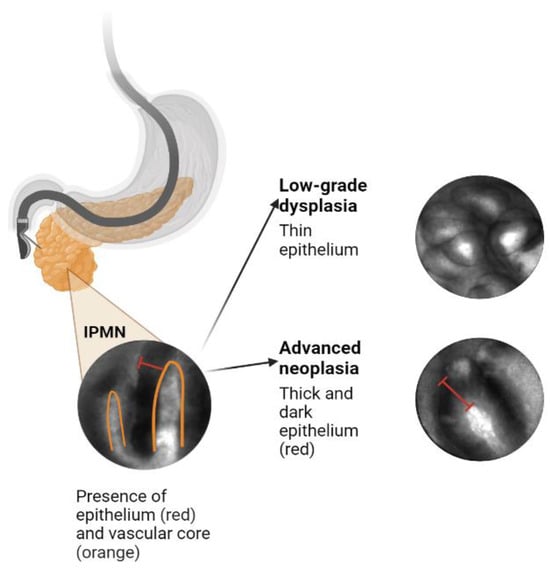6]. This creates a need for more precise diagnostic techniques that use existing information, such as cross-sectional imaging, cyst fluid (CEA, glucose, cytology) analysis, next-generation sequencing (NGS) of cyst fluid, and novel imaging biomarkers (confocal endomicroscopy). EUS-guided needle-based confocal laser endomicroscopy (EUS-nCLE) features of IPMNs are highlighted in