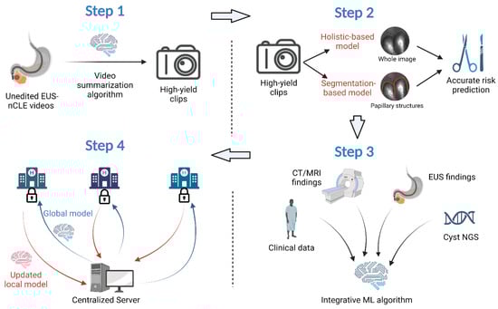 AI is increasingly being adopted in the field of medicine to derive actionable insights from extensive patient data and alleviate the workload of specialists. Shortcomings in current models utilizing nCLE for risk stratification of PCLs include the necessity for manual image pre-processing and the exclusion of pertinent data with significant predictive value. Our research group has previously developed nCLE-based CNN models for risk stratification of BD-IPMNs, which exhibited diagnostic accuracy surpassing that of standard-of-care guidelines, albeit using expert-edited endomicroscopy videos. We now present our strategy for enhancing the model’s accuracy and generalizability, which encompasses a video summarization algorithm, an integrated ML algorithm that harnesses a vast amount of data, and the validation of our predictive model within a multi-center cohort. While ML and AI require extensive imaging and datasets, the aspiration of this methodology review is to encourage researchers worldwide to collaborate in enhancing the management of patients with pancreatic cystic lesions.