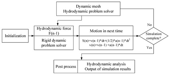 Firstly, the fluid and boundary conditions are initialized. Then, governing equations are used to calculate the flow field information and solve the hydrodynamic problem. UDF receives the hydrodynamic results and uses them to calculate the rigid dynamics of the object. By calculating the dynamic problem, the motion of the object at the next moment can be derived. Finally, the input data used to reset the boundary conditions and control the dynamic mesh are refreshed to start the next calculation cycle. After repeated calculations, the fluid–solid coupling problem is solved. The kinematics and dynamics result of the object and the flow field information are obtained.