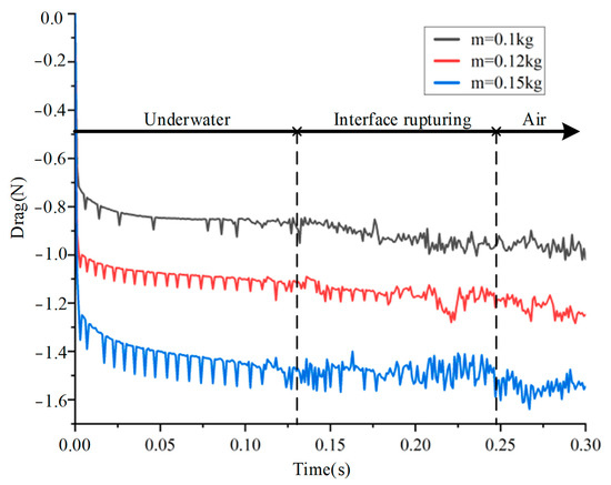 It can be seen that the force curve is basically the same in the development trend, showing a three-stage type, including underwater, interface rupturing, and air. At the beginning of the locomotion, the resistance begins to increase rapidly and then remains stable until it contacts the water surface. At about 0.13 s, it began to break through the water surface, and the balance between buoyancy and gravity was broken. The decrease of buoyancy and viscous force led to the gradual increase of resistance. After completely leaving the water, the resistance fluctuates around the gravity and tends to be stable. In addition, a small amount of water attached to the object will cause the resistance to increase slightly, which is in line with the actual situation.