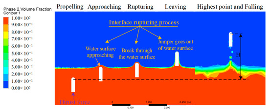 The factors that affect the motion performance of objects are divided into internal factors (structure parameter) and external factors (motion parameter). The hydrodynamic force of the jumper has a great influence on its motion when it moves amphibiously, especially when it crosses multiple environments. Therefore, it is very important to explore appropriate structural parameters to reduce water resistance and improve motion performance from the perspective of internal factors. Here, the influence of the internal factors of the jumper on the water jump performance was first analyzed. To obtain the relationship between the jump height and the mass, diameter, and overall length of the object, a series of water jump simulations were performed. The vertical motion process through the multiphase interface is shown in Figure 6. The object begins to move under the action of an instantaneous propulsion force, including the process of accelerated propulsion, interface breakthrough, air flight, and landing, in which the interface breakthrough includes the water surface approaching, breaking through the water surface, and going out of the water surface.