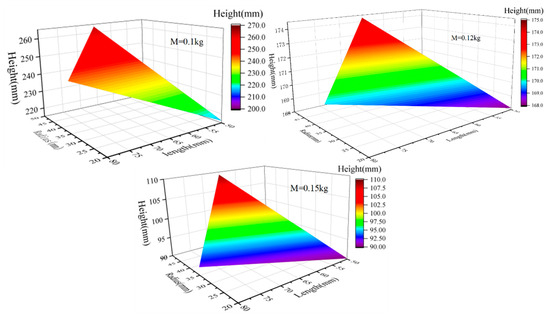 The mass range of the object is 0.1–0.15 kg, the radius is 20–50 mm, and the length range is 50–80 mm. Note that each simulation is performed under the same constraints as the external conditions, and repeated verification is performed. The maximum height is defined as the distance difference between the jumper’s head from the initial position to the beginning of the landing. The verification results show that the maximum jump difference of a set of simulations is less than 5%, indicating the consistency of the simulation results and that its subtle influence can be ignored.