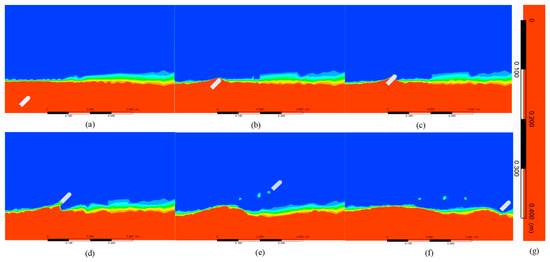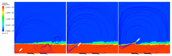 The velocity of movement is the result of the combined action of multiple forces. The streamline of the velocity field of the object passing through the water surface is shown in Figure 12. It can be seen that at the beginning of the movement, the streamline of the distal water surface is denser, and the water surface is constantly lifted, which is equivalent to increasing the initial water depth and affecting the jumping height of the object. As the object continues to rise, the streamline at the tail gradually becomes dense. The tension and inertia of the medium make it continue to follow the object for a certain distance, that is, the water column below the object, which also has a certain impact on the jumping performance of the object. From the streamline of the velocity field, the jumping angle indirectly changes the water depth to affect the jump height of the object. Therefore, the angle has a greater impact on the motion performance of the object than the water depth.