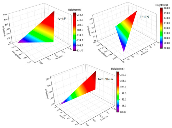 The simulation of multiple jumps is carried out, and the cloud diagram of the influence of force, water depth, and jump angle on the jump height can be obtained, as shown in Figure 9. The range of force is 10–12 N, the range of water depth is 150–250 mm, and the range of jump angle is 45–75°. It should be noted that this is the angle between the direction of motion of the jumper and the horizontal line. Through the longitudinal comparison with the amplitude when analyzing the structural parameters, it can be intuitively seen that under the premise of selecting the optimal structural parameters, the motion parameters have greatly improved the jumping performance of the object, and the highest jumping height has reached 0.34 m, which also shows the importance of optimizing the motion parameters from the side. Then, the influence of the interaction between the motion parameters on the motion performance is compared horizontally. It can be seen that the amplitude of the jump height is about half of the other two parameters when the value of the force is constant, which indicates that the force has the most direct influence on the motion performance, which is also consistent with the results in the theoretical analysis. However, there are four extreme special situations to explain first. When the water depth is 0 m (i.e., single phase of the air) or the jumping angle is 90° (i.e., vertical motion), the jumping height is the highest, and when the depth tends to infinity (i.e., single phase of the water) or the angle is 0° (i.e., parallel to the water surface) the jumping height is the lowest. Therefore, it is impossible to intuitively judge which one has a greater impact on the performance of the movement.