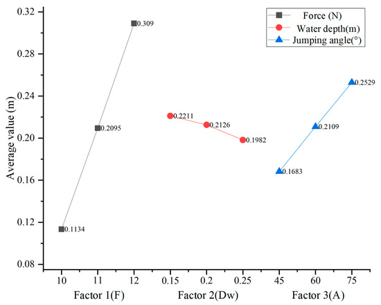 As shown by the theoretical analysis and the actual situation, the jump height of the object increases with the increase of the force, which indirectly verifies the correctness of the simulation results. By comparing the maximum jump under different water depths and jump angles, the maximum jump law with the increase of water depth and angle is obtained. To view the influence of each level of the factor intuitively, the average value of each factor is shown in Figure 10. From the perspective of three factors, combined with the comparison of R value (factor range), factor 1 force is the optimal factor, followed by factor 3 jump angles, and finally, factor 2 water depth. Therefore, the order of the three factors was factor 1 (force) > factor 3 (jump angle) > factor 2 (water depth). According to the optimal level of each factor, the third level of factor 1 is 12 N, the water depth of factor 2 is 0.15 m, and the jump angle of factor 3 is 75°.