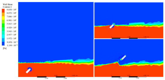 The flow field information of the object in the motion process will be extracted for the following fluid analysis by taking the jumping angle of 45° as an example. The force area of the jumper has a great influence on the water resistance in the process of water movement. Therefore, the contour of the wall shear is extracted and analyzed first, as shown in Figure 11. It can be seen that the shear force is mainly concentrated in the head of the arc at the beginning of the locomotion. When it is close to the water surface, the force balance on both sides of the jumper is broken due to the problem of the movement angle, and the force below gradually increases to produce a clockwise torque, which further reduces the movement angle. After the object jumps out of the water, it is mainly concentrated in the tail. It can also be seen from the whole movement process that the shear stress of the object is mainly concentrated at both ends, and the two sides of the object are smaller, indicating that the length of the object has little effect on the shear stress. For its structural parameters, the diameter has a greater performance on the object than the length.