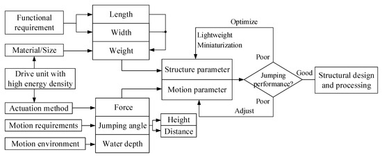 Based on the simulation results, the influencing factors of jumping performance are summarized and analyzed, and the corresponding countermeasures are put forward, as shown in Figure 13. Among them, the weight of the object and its thrust force have the greatest influence on the motion performance and are also the primary factors to be considered in the structural design. The following four suggestions are provided for the design of cross-media robots for reference: The new material lays a foundation for optimizing and improving the structural design of the amphibious robot. It is necessary to consider the combination of new materials to realize the lightweight of the robot in the structural design. Secondly, the robot should be as close to the water surface as possible to further improve the motion performance when its task is not considered. Then, the jump angle of the robot should be adjusted according to the height of the obstacle to meet different locomotion requirements. Finally, we can see that the driving unit with high energy density not only affects the driving mode and then affects the value of the propulsion force, but it also has a direct impact on the weight of the object. This unit is the key to realizing miniaturization and explosive motion and will be one of the key contents of the research on underwater jumping robots.