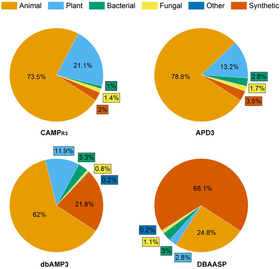 Composition of AMP databases according to the source of peptides with antifungal activity. Total number of AFPs in each database was taken as 100%: 1311, 1144, 5968 and 5540 for APD3, CAMPR3, DBAASP and dbAMPs, respectively.