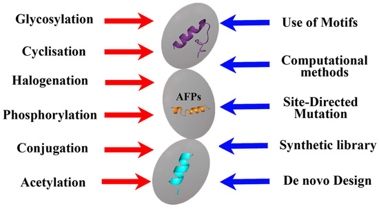 Summarizing the information presented, it can be concluded that various methods of the chemical modification of natural peptides, including phosphorylation, cyclization, halogenation, etc. [65], can be used to obtain semi-synthetic AFPs (Figure 4).