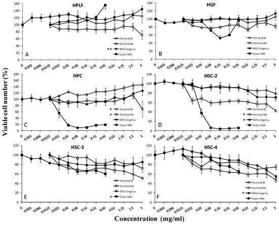 Dose response of Portland Bi, Portland Ba, MTA Angelus, and SuperEBA in cultures with normal cells (A) HPLF, (B) HGF, (C) HPC) at a 1:3 ratio of 6–8 PDL and cancer cells (D) HSC-2, (E) HSC-3, (F) HSC-4 at concentrations of 5 × 104 cell/mL, near 90% confluence and were inoculated in 96-microwell plates and incubated for 48 h with varying concentrations from 0 to 5 mg/mL. The relative viable cell count was assessed using the MTT method. Each value represents the Mean ± SD of triplicate assays (n = 9), 540 nm absorbances. HPLF = human periodontal ligament fibroblast, HGF = human gingival fibroblast, HPC = human pulp cells, HSC = human oral squamous carcinoma cells sourced from three distinct patients (−2, 3, 4). PDL = population doubling level; SD = standard deviation. * p < 0.05, ** p < 0.01 U Mann–Whitney test.