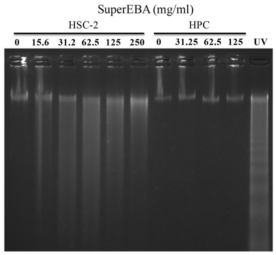 HPC was seeded at a 1:3 cell density, while HSC-2 cells were plated at a concentration of 3 × 104 cells/mL in 6-well culture plates. Subsequently, a 48 h incubation period allowed for complete cell attachment. Following this incubation period, cells were exposed to varying concentrations of SuperEBA for HSC-2 (ranging from 0 to 250 mg/mL) and HPC (ranging from 0 to 125 mg/mL) over a duration of 6 h. After exposure, cells were subjected to two consecutive washes with PBS (-), and then they were harvested using a rubber policeman while maintaining a cold environment. Cell collection was followed by centrifugation in 1.5 mL microcentrifuge tubes at 20,000× g. To isolate biomolecules, the cell pellets underwent lysis in a solution containing 50 μL of lysate buffer composed of 50 mM Tris-HCl (pH 7.8), 10 mM EDTA, and 0.5% (w/v) sodium N-lauroylsarcosinate. This lysate was further treated with RNase A (0.4 mg/mL) and proteinase K (0.8 mg/mL) for a 2 h incubation period at 50 °C. Subsequently, a NaI solution (50 μL, consisting of 40 mM Tris-HCl, pH 8.0, 7.6 M NaI, and 20 mM EDTA-2Na) was added, followed by ethanol (250 μL). The resulting mixture was then centrifuged for 20 min at 20,000× g, leading to the formation of a precipitate. This precipitate was washed with 1 mL of 70% ethanol and subsequently dissolved in TE buffer containing 10 mM Tris-HCl (pH 8.0) and 1 mM EDTA-2Na. Each sample, equivalent to 10–20 μL and corresponding to a cell concentration of 5 × 105 cells/mL, was loaded onto a 2% agarose gel for electrophoresis in TBE buffer composed of 89 mM Tris-HCl, 89 mM boric acid, and 2 mM EDTA-2Na. After electrophoresis, the DNA was visualized through UV irradiation and photographed, as previously described [10]. Furthermore, as a means of positive control, DNA extracted from HL-60 cells undergoing apoptosis induced by UV irradiation (at a rate of 6 J/m2/min for 1 min) was simultaneously included in the experiment [11].