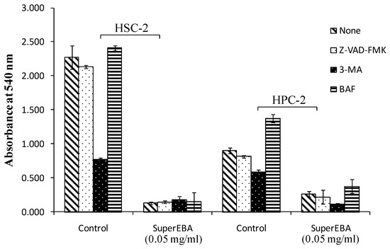 HPC cells were initially inoculated at a 1:3 density, while HSC-2 cells (6 × 104 cells/mL) were seeded onto a 96-well plate and incubated for 24 h to achieve complete adherence. Subsequently, the cells were preincubated for 60 min with specific compounds: 50 μM of the pan-caspase inhibitor (Z-VAD-FMK, Biomol, Enzo Life Science, Plymouth Meeting, PA, USA), 10 mM of 3-methyl adenine (Sigma-Aldrich), or 100 nM of bafilomycin (BAF) (Wako Pure Chem Co., Tokyo, Japan). SuperEBA (0.5 mg/mL) was added and incubated for 24 h. The viable cell number was assayed by MTT methods at 540 nm [13].