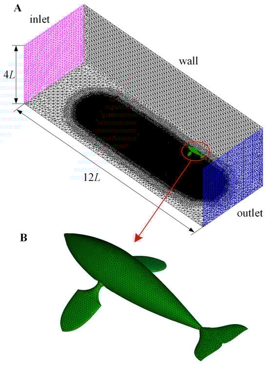 The physical size of the swimming domain with the related grid division are shown in Figure 2. The overall size of the water tank is 12 L × 4 L × 4 L, providing enough space for the dolphin to achieve self-propulsion. The bionic dolphin is placed at the center of the ybzb plane, and the dolphin’s tail is 1 L away from the outlet plane along the oxb axis direction. The paddling of pectoral fins is a highly stretchable motion process, so we use an easy-to-adjust tetrahedral grid to disperse the entire domain, in which the density of the grid around the dolphin is gradually refined to capture the detailed motion of the dolphin and structure of flow field. In Figure 2B, the surface of the dolphin is discretized into a uniform triangular grid. In a large number of previous studies [,], we used this meshing method to simulate the flexible swing of various fins to achieve underwater swimming. For the boundary conditions of inflow and outflow, we set zero velocity and pressure gradient for both the inlet and outlet boundary.