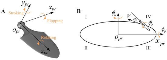 In the body-attached coordinate system of the right pectoral fin, point opr represents the starting pivot of the butterfly flapping mode, the oprxpr axis is along the span direction of the pectoral fin (i.e., the longitudinal direction of the dolphin body), the oprypr axis is along the normal direction and the oprzpr axis is along the chord direction of the pectoral fin. The kinematic model of the composite motion, including the pitch angle ϕp, the azimuth angle ϕa and the roll angle ϕr, is defined as follows: