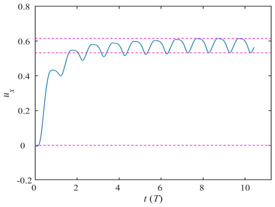 The self-propulsion of the dolphin in the butterfly flapping mode undergoes a dynamic process of gradual convergence. Since the motion form is instantaneously symmetric about the xbyb plane, the motion law in the ozb axis direction can be ignored. We assume that the stationary dolphin is operated directly from State A in Figure 4, and specify the kinematic performance parameters by defining the water striking frequency f = 5 Hz, the maximum pitch angle ϕpmax = 20° and the maximum azimuth angle ϕamax = 40°. The time history of the instantaneous forward velocity coefficient ux shown in Figure 6 reveals that the bionic dolphin starts from a standstill, gradually accelerates after passing through the preparation phase and finally reaches a steady speed state. During the stable period of time, the instantaneous forward velocity coefficient ux fluctuates between 0.53 and 0.62, which is different from the sine asymptotic curve exhibited by the BCF self-propelled mode []. The curve law converged by the butterfly flapping mode is characterized by sharp narrow valleys and smooth peaks. The specific reasons for the formation will be analyzed in conjunction with hydrodynamics in the following sections.