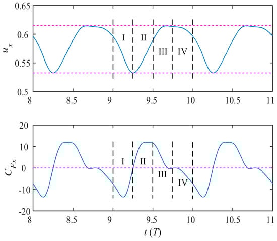 After reaching the steady state, the instantaneous forward velocity coefficient ux and propulsive force coefficient CFx along the swimming direction are periodically changed in the form of non-sine waves, as shown in Figure 7. In a single period T, the curves of ux and CFx are divided into four regions I, II, III and IV, corresponding to the four morphological changes in the Figure 4. The function of force in the whole process changes from resistance to propulsion, and finally to resistance. The effective propulsion part corresponds to Phases II and III. At this time, pectoral fins moving to the foremost hit the water back in a large area, causing the dolphin to gradually increase CFx and produce the maximum propulsion force at (n + 3/4)T. Phases I and IV correspond to the return of the dolphin’s pectoral fins. Although the water hitting area is small at this time, the ineffective action still affect the propulsion progress and the dolphin obtain the maximum resistance at (n + 0)T. In the process of the instantaneous force variation, dolphin is in the acceleration phase (II and III) when the force coefficient CFx is positive, and the dolphin is in the deceleration phase (I and IV) when CFx is negative. Therefore, at the end of the Phase III, the dolphin obtains the maximum propulsion velocity in a single cycle.
