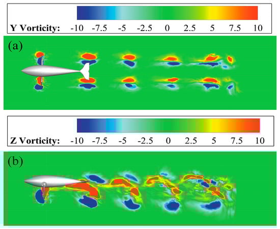 Figure 8 shows the instantaneous vorticity fields of the two sections (a) and (b) in the stable cruise state, corresponding to the top view of the dolphin and the side view of the right pectoral fin, respectively. Once the robotic dolphin starts to move forward, each cycle of the butterfly movement can produce two pairs of symmetrical and ordered vortex structures downstream of the double pectoral fins (Figure 8a). Figure 8b demonstrates from the xbyb slices that the wake vortex structure is presented with the characteristic double-row vortex law of the butterfly swimming pattern. Two co-directional vortices are located on the center line of the vortex street, and co-directional vortices with the same physical signs are easily merged, while the two opposite vortices are located on both sides. The overall arrangement of vortices is still in the form of a reverse Karman vortex street. The bionic dolphin makes full use of the backward jet in the wake area at the rear edge of the pectoral fins to absorb energy and produce a strong propulsion effect.