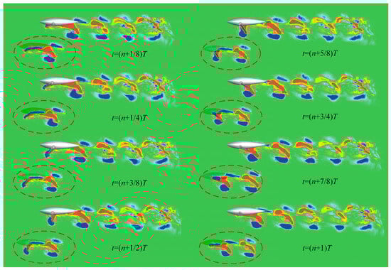 Figure 9 shows the vorticity profile of the left pectoral fin within one motion cycle in the xbyb slice, and the details of the vortex shedding blocked by the dolphin’s body are shown in the red dotted frame. The overall pattern of the vortex street changes from the four neat and regular vortex structures in the upstream to the chaotic and scattered vortex distribution in the downstream. When t = (n + 1/8)T, the inner and outer sides of the elliptical trajectory show flow vortices with different rotation directions, which is also called antiphase. When the left pectoral fin moves to the upstream limit of the stroke angle (t = (n + 1/4)T), the red vortex on the inner side falls off firstly. At the next moment, the blue vortex on the outer side also falls off, and the entire shedding path follows the elliptical trajectory of the bionic pectoral fin. From (n + 3/8)T to (n + 5/8)T, the vortices attached to both sides of pectoral fins form and grow again. The vortices fall back from the two vortex streets with opposite directions alternately in the downstream stages of resuming the water stroke (t = (n + 3/4)T and t = (n + 7/8)T), where the outside falls off faster than the inside. Because the newly detached inner vortex street is quickly covered by the attached vortex of the flapping pectoral fin, the two same-directional vortices in the middle street merge together in the newly formed cycle of the vortex street, which split laterally in the second cycle. The entire tail space is arranged with staggered double-row wakes. The formation of the four vortices is related to the rapid back and forth motion of the dolphin. They have a phase difference with each other, and they appear in different stages of motion, forming a “vortex dislocation” [].