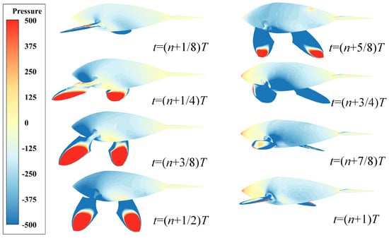 To unveil the propulsion mechanism of the butterfly-mode motion based on the elliptical trajectory, Figure 10 portrays the pressure distribution and evolution after the bionic dolphin attains a stable state. By extracting the dynamic pressure distribution on the surface of pectoral fins during a cycle, we note that at time (n + 1/4)T, the dolphin reaches its anterior limit position (State B in Figure 4). A red high-pressure field forms at the tip of the pectoral fins hitting the water surface, extending longitudinally inward along the fin surface. By time t = (n + 3/8)T, the high-pressure area on the fin’s surface reaches its maximum coverage, corresponding to the peak CFx in Figure 7. From (n + 1/2)T to (n + 3/4)T, the pectoral fins, having passed through their posterior limit position (State C in Figure 4), gradually release the “high-pressure tide”. This tide eventually recedes and dissipates as the dolphin moves towards its return journey (State D in Figure 4), signifying the formation of a red high-pressure core at the leading edge of pectoral fins. Moreover, due to inertial effects, a high-pressure core forms at the head to counteract fluid reaction forces, while the dolphin’s body and fin surface are covered by a blue low-pressure field. Starting from (n + 3/4)T to (n + 1)T, as the pectoral fins approach their upper limit position (State A in Figure 4), a central red-yellow high-pressure region appears on the upper fin surface. Though the strength of the pressure field is not as strong as the hitting point at the leading edge of the fin surface, the combined action of high-pressure regions on the fin surface, leading edge and head determines the bionic dolphin’s force state during this phase.