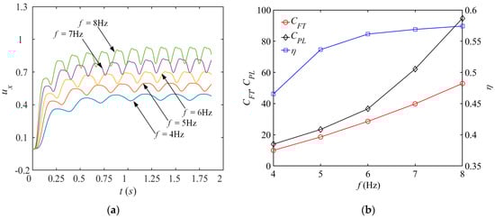 Plots of propulsion performance parameters for different water striking frequencies. (a) Relation between ux and f; (b) Relation between CFD, CPL, ηD and f.