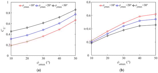 Variations in propulsion performance parameters as functions of offset angle. (a) Relation between ϕpmax, ϕamax and CU; (b) Relation between ϕpmax, ϕamax and η.