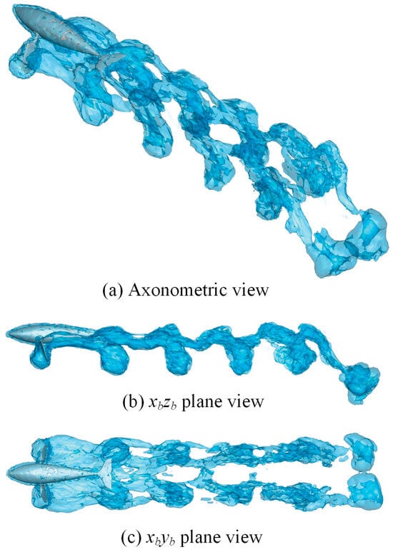 Section 3.2 presents the 2D wake structures, revealing the propulsion performance of the butterfly motion from the details of the vorticity profile. In this section, we use the q-criterion to extract the 3D vortex iso-surface of the elliptical trajectory. Based on the kinematic law of Figure 4, we depict the vorticity iso-surface from three perspectives in Figure 13. The entire vortex layout presents a series of interlocking vortex loops. The vortex structure in a single cycle corresponds to a single sickle-like shape. It is a novel type of vortex that has not been reported, which is different from the elongated “hairpin” vortex ring generated by the caudal fin swings [].