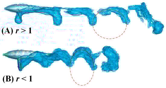 To reveal the effect of the ellipse trajectory produced by the offset angle on the wake structure, we keep the water striking frequency f and the minor axis b unchanged and adjust the size of the major axis a in the ellipse trajectory to control the ratio r. In Figure 15, we select two working conditions r = 5/3 and r = 1/3 to draw iso-surfaces. Careful observation reveals that the vortex structures with different r values follow the vortex street characteristics of elliptical trajectories. That is to say, when r is greater than 1, the vortex structure is a standard ellipse, otherwise it is an inverted one. After comparing the two working conditions, we find that the width of the vortex in the span direction is approximately the same at the initial stage of shedding due to the constant value of the minor axis. In the later stage of shedding, due to the high propulsion speed, the scroll structure in Figure 15A has more components along the forward direction, and the vortex rings are separated from each other. In Figure 15B, the vortex ring spacing is not as large as that in Figure 15A, which causes energy loss along the lateral direction. Therefore, the propulsion efficiency of working condition (B) is not as good as (A).