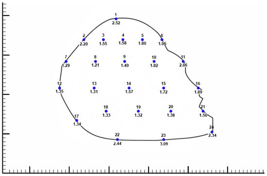 Average thickness measured at 24 predefined points from all 40 cartilaginous septums. The numbers below each point represent the average thickness at that point, measured in millimeters. The small hash marks on the scale represent 1 mm. The septum shape silhouette presented represents the 50th percentile shape that we developed into a 3D model.