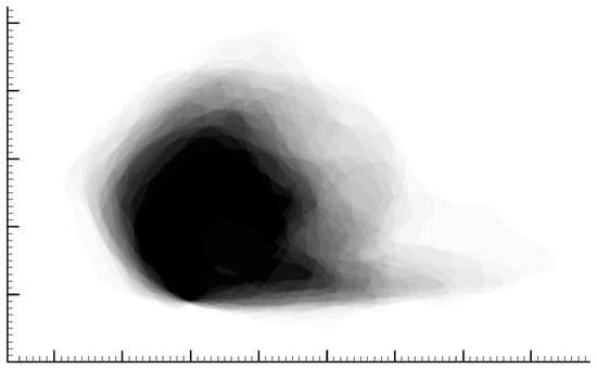 The pixel size was calibrated with the internal fiducial markers using Photoshop (CC 2018, Adobe, Mountain View, CA, USA). Image registration and anatomic co-registration were performed. The posterior caudal septal point (PCSP) of each cartilaginous septum was used for translational alignment, followed by rotational alignment with the posterior dorsal septal point (PDSP); this allowed for all the images to be aligned and rotated in the same way. Image processing was then performed, including the normalization of image sizes through Photoshop, the mapping of each septum, and a photograph pixel addition function to generate a histogram of the co-registered images. This essentially allowed us to overlay the silhouettes of all 40 septums, creating a composite shape. The overlay of all 40 septal silhouettes is depicted in a GIF file in the Supplementary Materials of this paper (Figure S1). The average shape, at the 50th percentile, was selected as the region where a mean of the septums overlapped; this corresponded to the shape extracted when selecting for 50% gray (Figure 2). In addition, variation in septal shape was plotted as the regions contained by 5% and 95% of the septums (Figure 3).