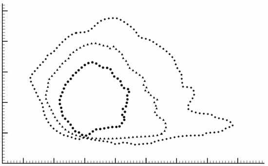 Mean cartilaginous septum shape, which was extracted from a composite image created by layering 40 cadaver septum images, is outlined by the triangles. The mean composite shape was extracted by selecting for the 50% gray image. The shapes defined by 95% and 5% of the septums were extracted in a similar fashion and are shown with circles and diamonds, respectively. The small hash marks on the scale represent 1 mm.