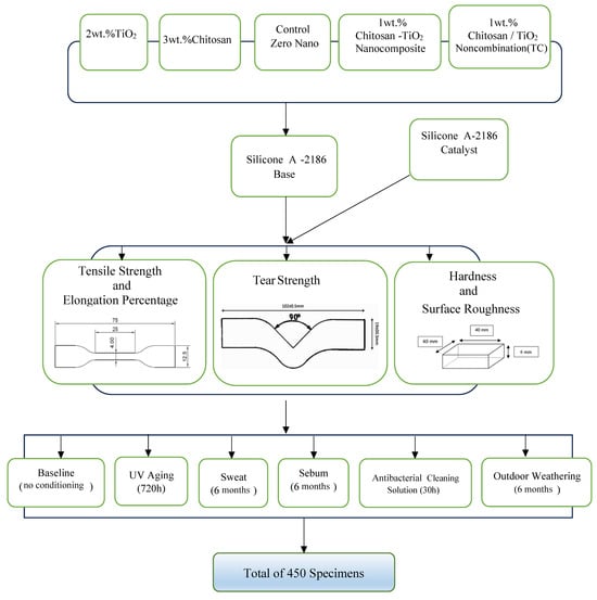 Five distinct classifications of silicone were methodically fabricated for this study. Figure 1 presents the study design. The first classification, the control, was composed of pure silicone without nanoparticle infusion. The second classification featured titanium dioxide nanoparticles incorporated into the silicone at a concentration constituting 2 wt.% [30,34] of the total weight. This was sourced from Sigma-Aldrich(Chemie GmbH Eschenstrasse 5 D-82024 TAUFKIRCHEN, Germany), identified by CAS Number 718467, and the nanoparticles possessed a primary particle size of 21 nm. The third classification incorporated chitosan, infused at a concentration of 3 wt.% by weight [22]. This substance was also obtained from Sigma-Aldrich under CAS Number 448869. The chitosan exhibited a degree of acetylation between 75% and 85% and a low molecular weight. The fourth classification was characterized by a hybrid nano-mixture of titanium dioxide (TiO2) and chitosan (TC), combined at a total concentration of 1% by weight, split equally with 0.5 wt.% of TiO2 and 0.5 wt.% of chitosan. The fifth and final classification involved the impregnation of silicone with a synthetically derived nanocomposite of chitosan–TiO2 powder at a 1% concentration by weight [35].