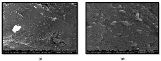 Field emission scanning electron microscopy (FESEM) was employed to investigate the surface morphology of various nanoparticle coatings and to obtain insights into the external morphology of the nanocomposite under study. The outcomes of this study show that FESEM plays a pivotal role in verifying the even and homogenous dispersion of nanosized, minimally aggregated TiO2 particles within the chitosan (CS) matrix, as illustrated in Figure 2.