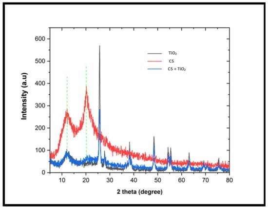 The crystalline structure of the synthesized nanocomposites was analyzed by using the method of XRD. The XRD patterns of the synthesized chitosan–TiO2 nanocomposite, pure TiO2, and chitosan are presented in Figure 3. The XRD pattern of chitosan displayed small, broad peaks at (11.8°) and (20.0°), indicating its semi-crystalline structure. This suggests that the incorporation of TiO2 into the chitosan matrix predominantly occurs in the semi-crystalline region of chitosan.