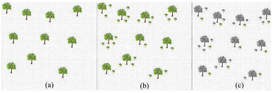 where stands for the trees in the population. The working diagram of the TSA is given in Figure 1 [30]. Here, trees are first planted in the search space (a), then seed production is performed for each tree (b), and finally seed selection is performed (c). The pseudo code of the TSA is given in Algorithm 1 [31].
